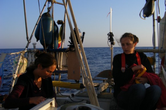 Véro en fin de quart. Soleil levant... il fait bon trainer sur le pont