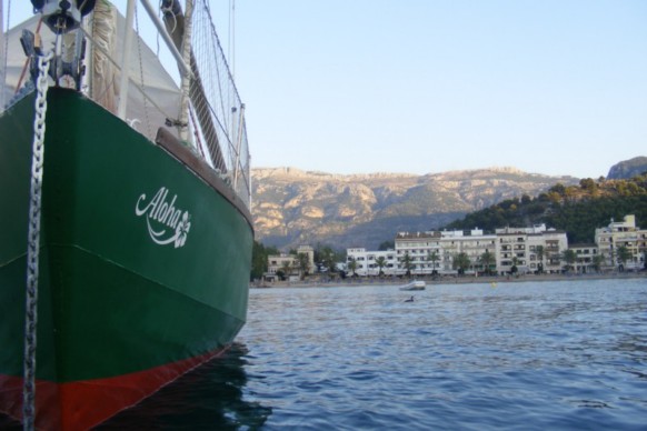 Après 57h de trajet, mi voile mi moteur, on jète l'ancre dans la baie de Soller. Les fonds sont de bonnes tenues et notre ancre croche du premier coup. Le bateau est déja rangé et il ne reste plus qu'à mettre en place le taud. Obligatoire, car il ne doit pas faire loin de 40°C. Une bière fraiche bien méritée pour tout l'équipage et PLOUF! A la flotte. Cette fois, le capitaine y va aussi. 10m de fond, On progresse :-)
